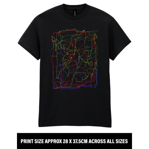 This black T-shirt features a vibrant and intricate rail network design, taken directly from the world built in OpenTTD Viewer Game #36. While fans will recognise its origins, the artwork also stands on its own as a bold, abstract design that looks great anywhere.